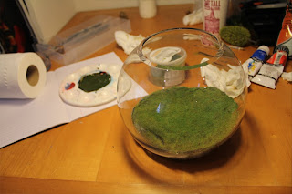 I then painted over the PVA base a greeny brown colour mixed with PVA, which made it possible to stick grass on: